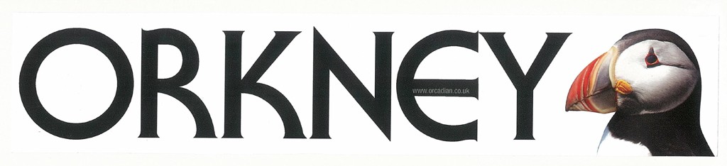 Window sticker with the word ‘Orkney’ and a picture of a puffin.